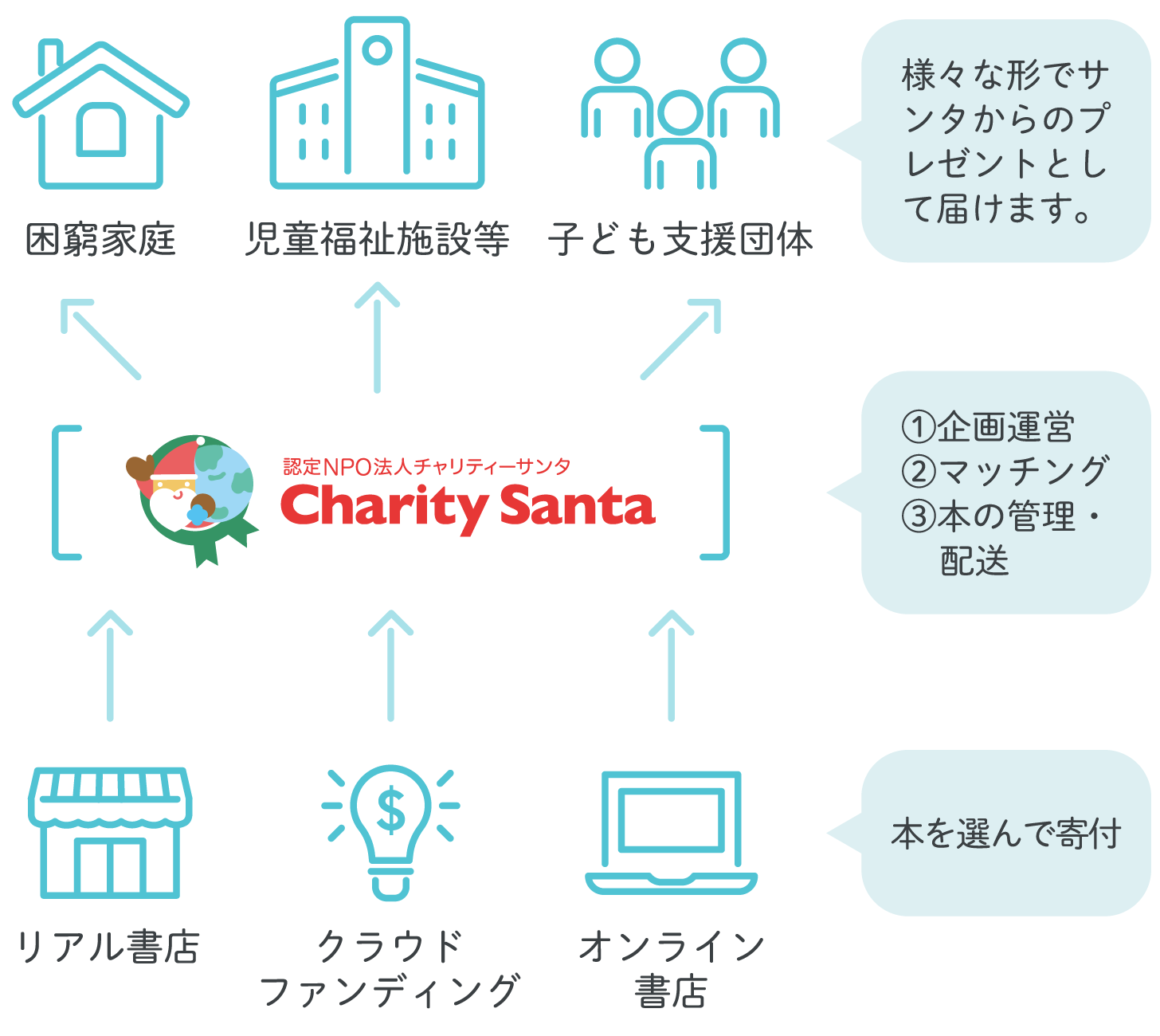 リアル書店やオンライン書店、クラウドファンディングで寄付された本を困窮する子どもたちに届けます。
